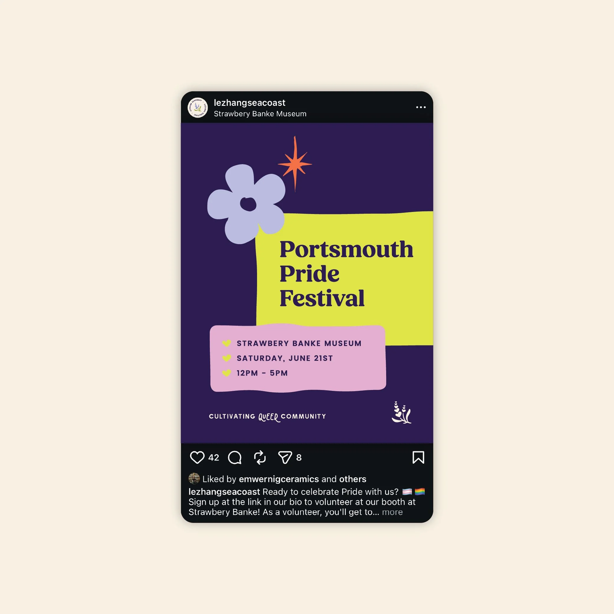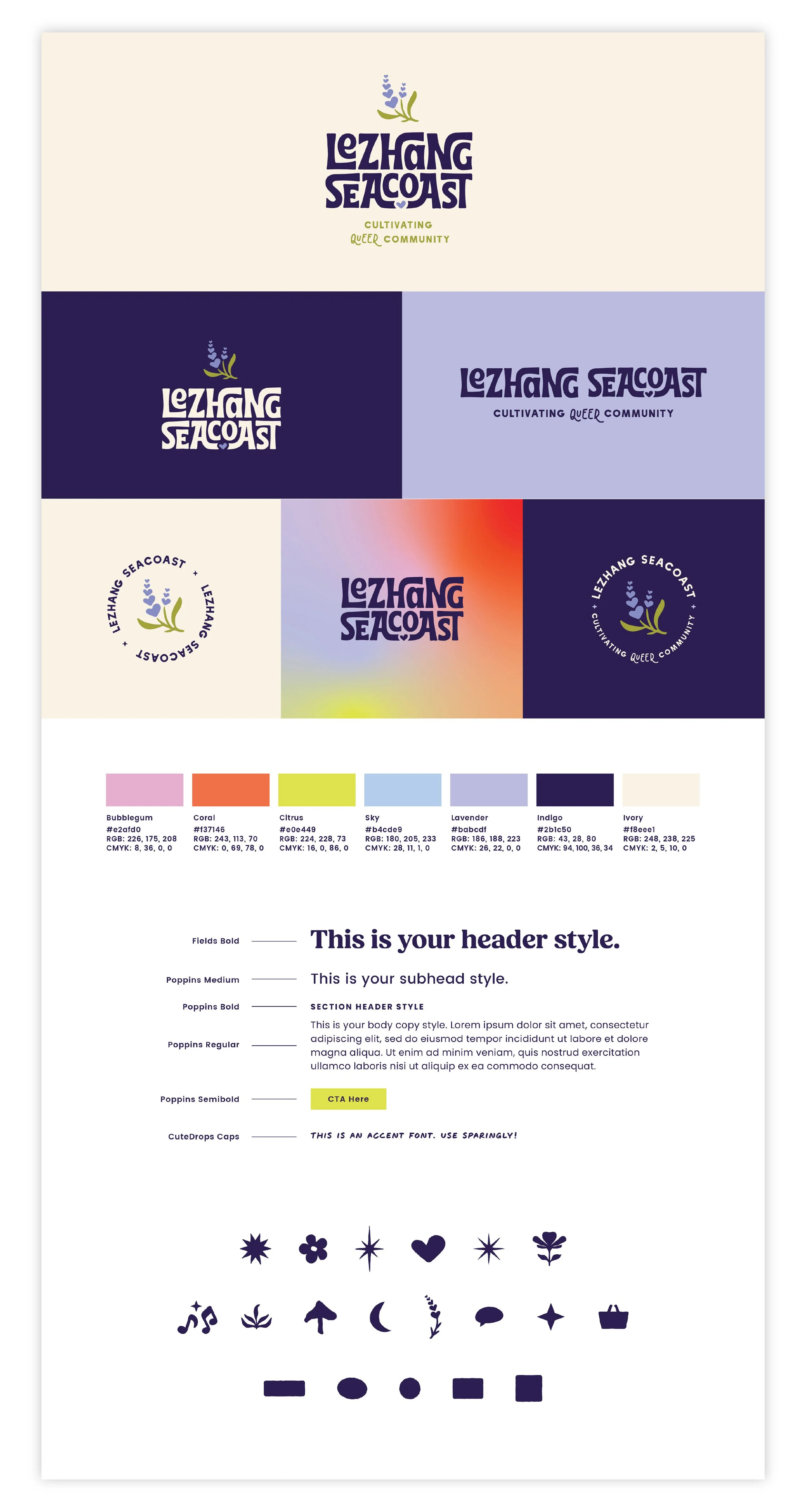 LezHang Seacoast is a grassroots queer community organization rooted in connection, safety, and care. What began as a simple park hang during the isolation of COVID quickly grew into a vibrant network of regular gatherings for queer adults across the NH Seacoast. I partnered with LezHang to create a cohesive brand identity that captured that sense of belonging while giving the organization a clear, recognizable visual presence. Through a collaborative process, we developed a bold and accessible brand system designed to feel warm and welcoming. The final identity provides clear guardrails for event promotion, partnerships, and future growth while staying true to the heart of the community.